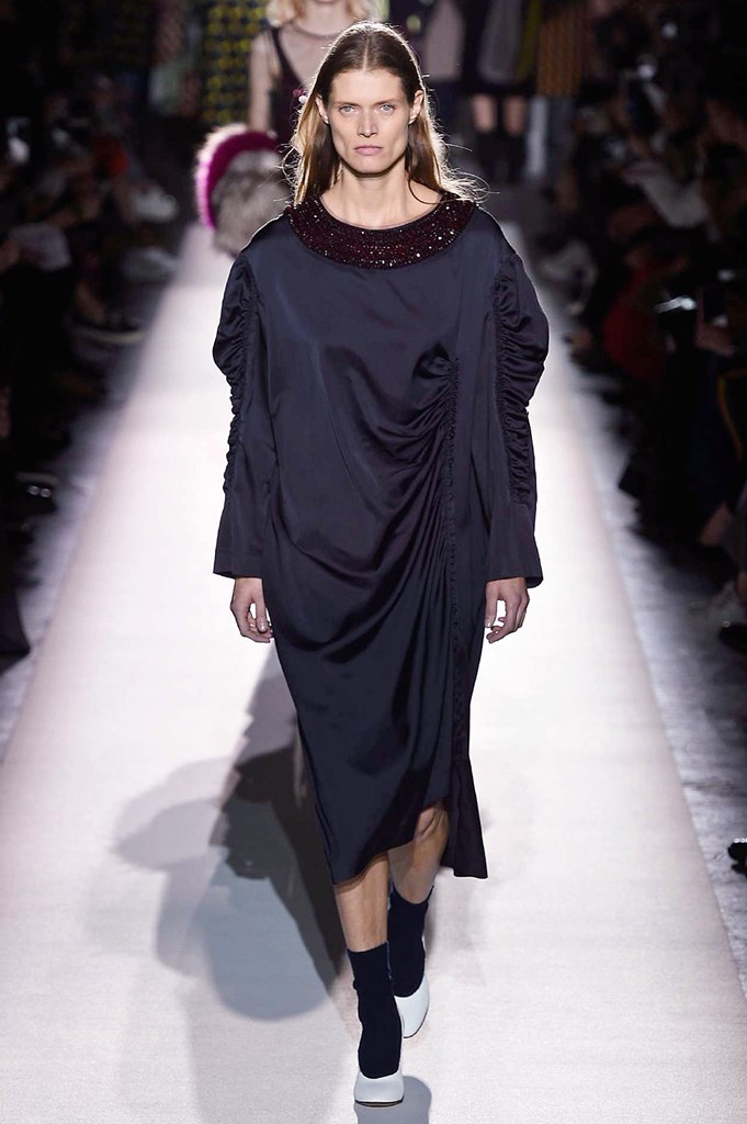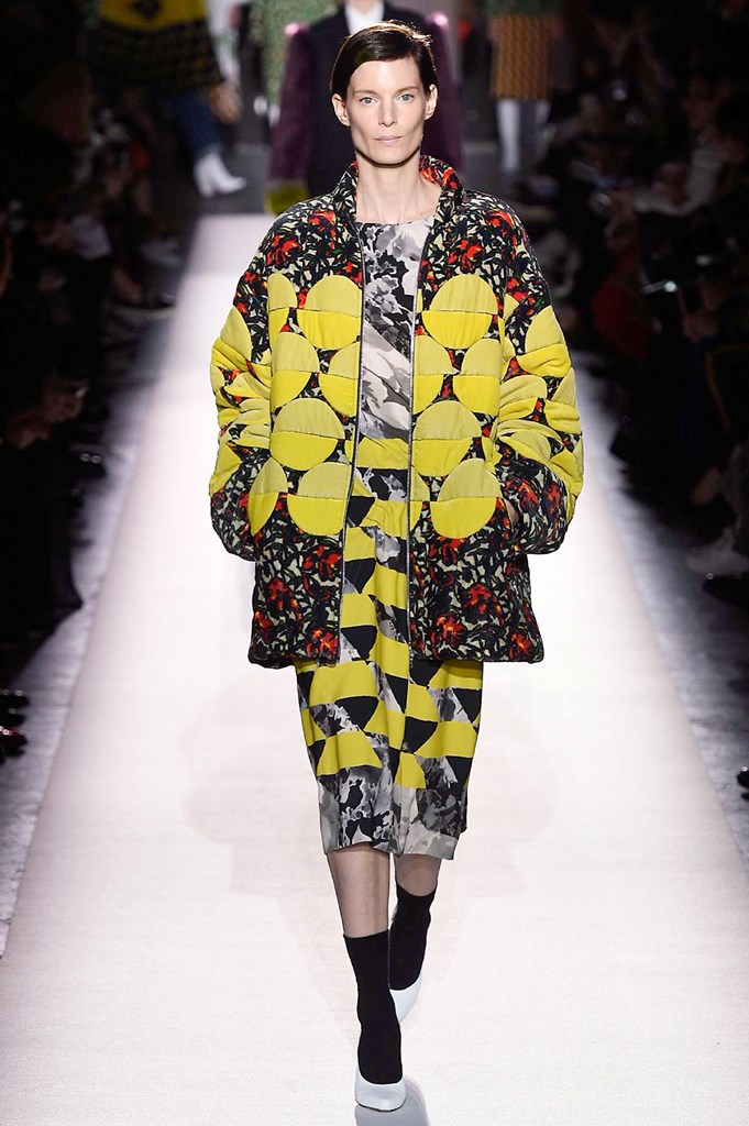 Ahora bien, la protagonista del desfile fue la que tenía que ser: la moda. Más en concreto, la moda de Dries van Noten. Por mucho que el diseñador se empeñara en esa austeridad que le es tan conocida, hay que reconocer que esta colección número 100 para el próximo otoño / invierno encapsula todas las constantes de la historia de van Noten: el minimalismo, la flexibilidad en el concepto de feminidad, la cerebralidad aparentemente fría, los estampados matemáticos, los coloridos calculados, las siluetas masculinas, los materiales técnicos… Todo estaba aquí para quien necesite refrescar la memoria y, sobre todo, para aquellos recién llegados que necesiten una lección de moda exprés. [Más información en la web de Dries Van Noten]