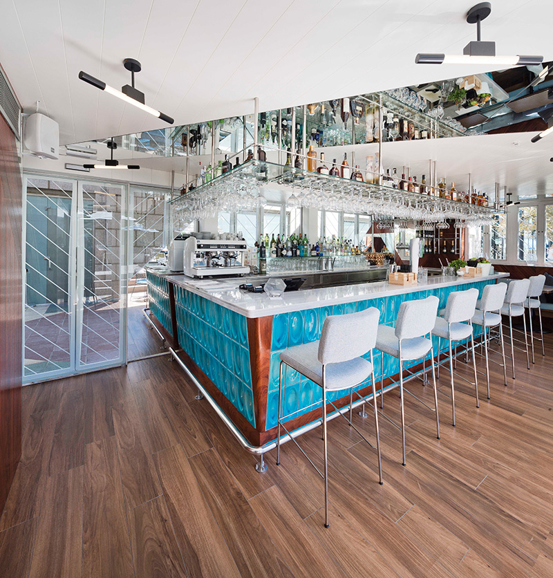 Un lugar mágico a la sombra del Peix de Frank Gehry donde el juego de niveles (se encuentra un nivel por debajo del paseo) facilita una intimidad apacible amplificada por la vegetación frondosa y una especie de lago artificial sobre el que se erige el salón terraza de Touché. Pero, claro, el emplazamiento no lo es todo, y aquí hay que reconocer que el trabajo de Lázaro Rosa-Violán Studio ha resultado vital a la hora de articular el espacio con una decoración en la que se aprecian continuas referencias a lo portuario (estamos donde estamos, claro) pero trayéndolas a la actualidad gracias a los colores amables y los materiales nobles puestos al servicio de lo confortable sin olvidar los preceptos de lo cool.